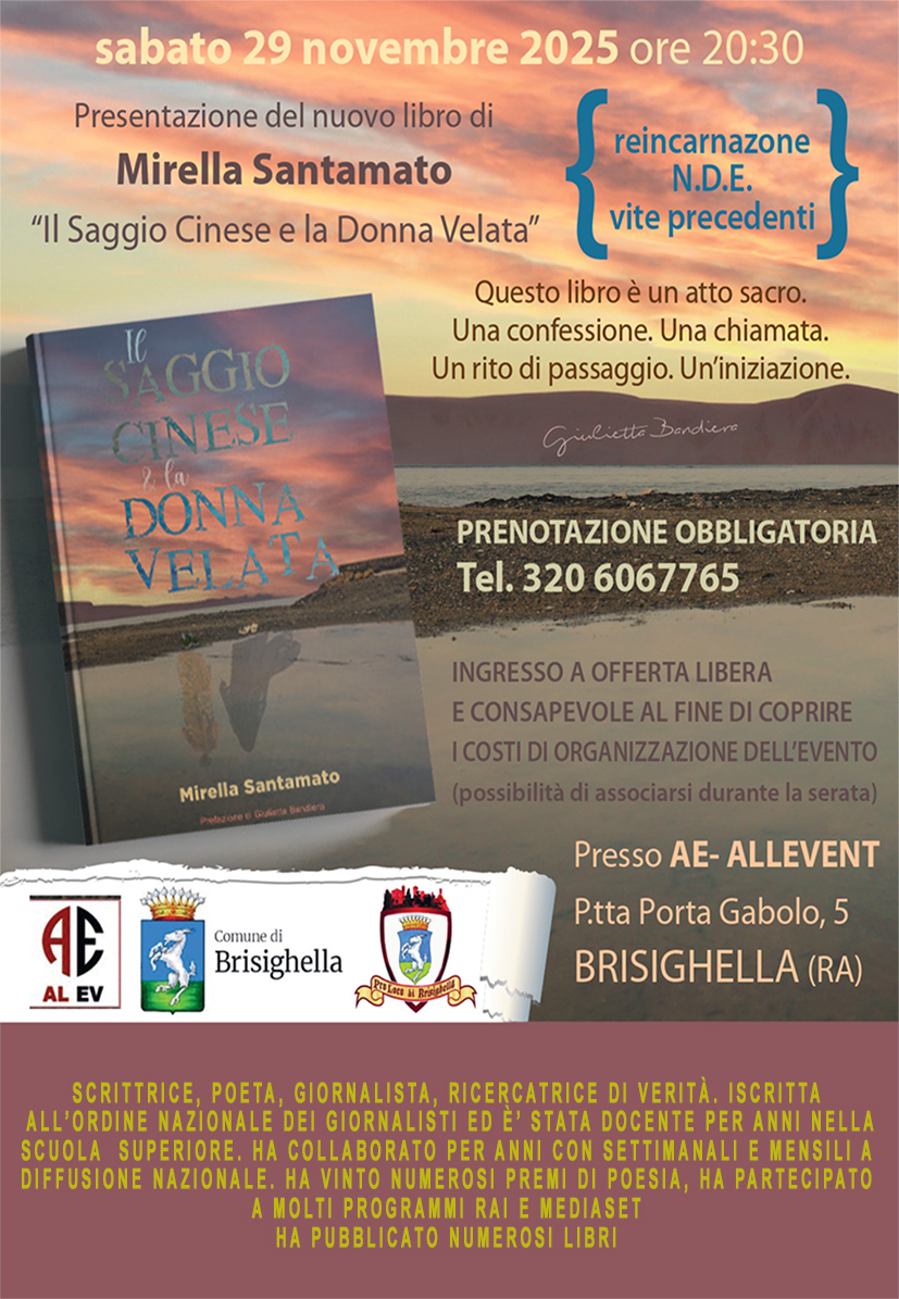 Sabato 29 novembre 2025, alle ore 20:30, presso la sede AE-Allevent in Piazzetta Porta Gabolo 5, Brisighella (RA), si terrà la presentazione del nuovo libro di Mirella Santamato, Il Saggio Cinese e la Donna Velata.